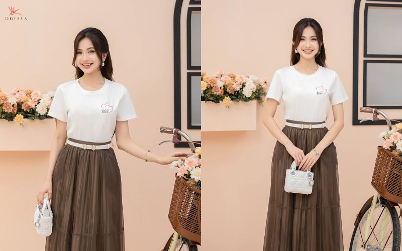 Nếu bạn muốn thêm phần nữ tính, hãy thử mix áo phông với chân váy Juyp. Đây là sự kết hợp không thể thiếu trong tủ đồ của các nàng yêu thích phong cách thanh lịch. Chân váy Juyp dáng ôm giúp tôn dáng, còn áo phông sẽ tạo điểm nhấn nhẹ nhàng, giúp bạn trông vừa trang nhã, vừa trẻ trung.