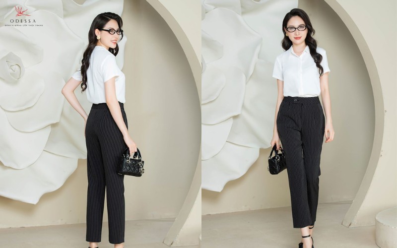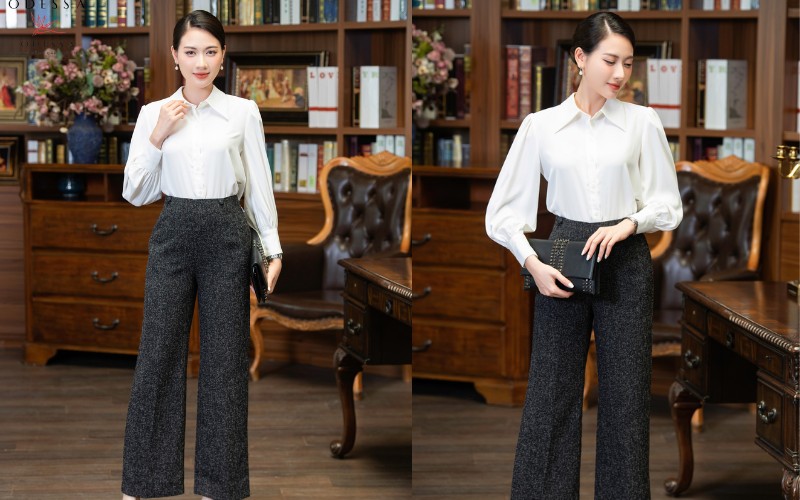Quần công sở kết hợp với áo sơ mi luôn là lựa chọn an toàn và thanh lịch. Tùy vào kiểu quần, nàng có thể chọn áo sơ mi kiểu cổ điển, hoặc áo sơ mi cách điệu để tăng thêm sự nữ tính.