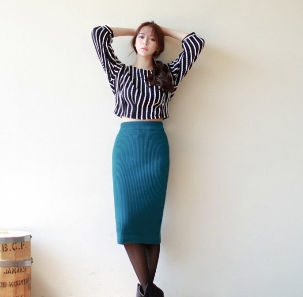 Một chiếc chân váy midi cạp cao có chất liệu dày dặn và gam màu tươi sáng như dạ hay len sọc tăm sẽ giúp đánh lừa thị giác người đối diện. Với chân váy kiểu này, đôi chân của bạn như được kéo dài ra. Mix chân váy ôm cạp cao với áo len dáng ngắn kiểu coptop hoặc đóng thùng kết hợp với đôi boots ôm chân sẽ giúp bạn có set đồ hoàn hảo nhất.