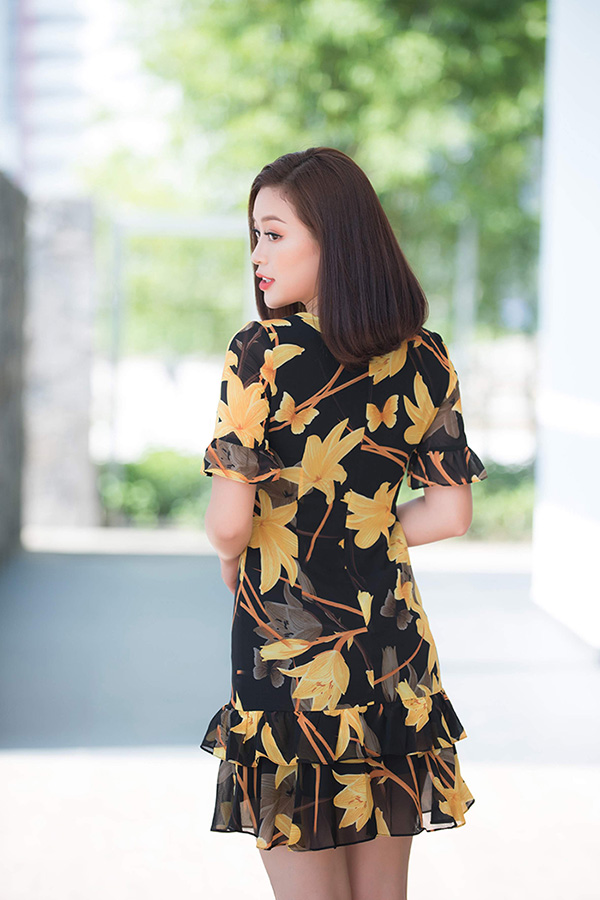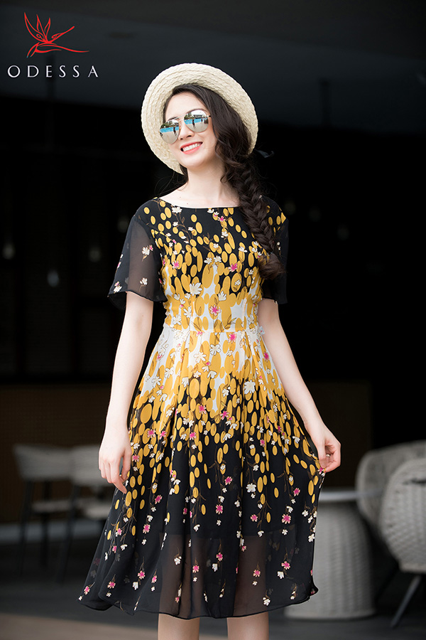 Lấy sự hòa hợp của màu vàng và màu đen làm nguyên lí, đầm xòe phối họa tiết trên nền vài đen mang đến những trải nghiệm mới