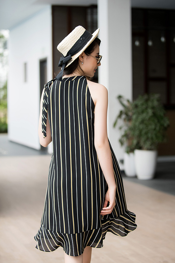 Đầm cổ yếm họa tiết kẻ sọc nền đen