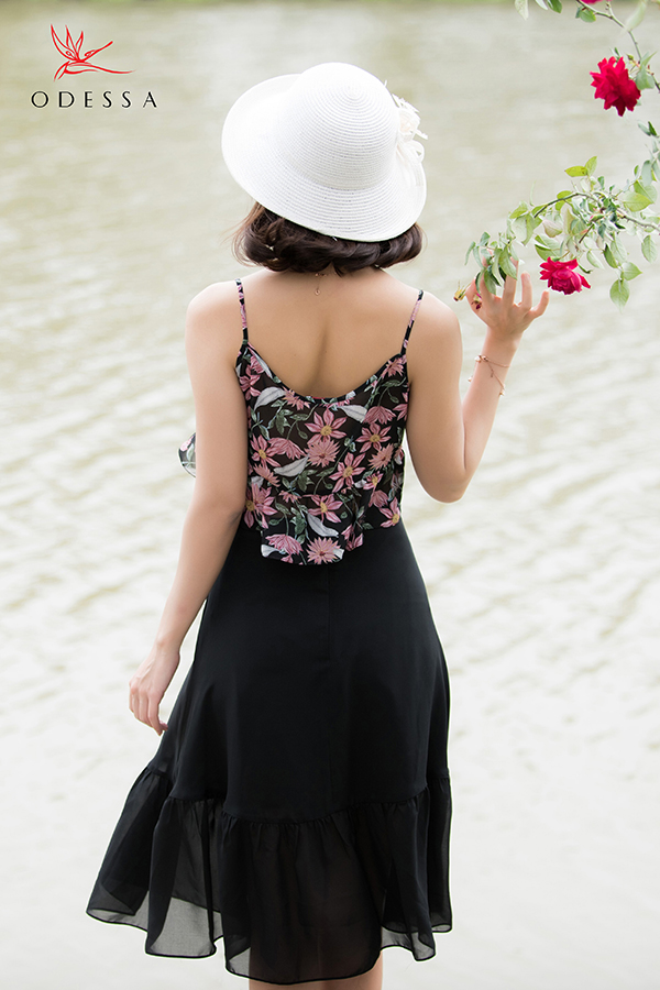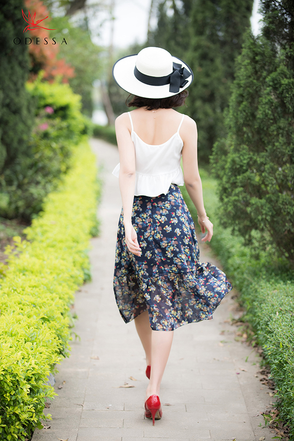 Áo hai dây màu trắng kết hợp chân váy midi hoa nhí...