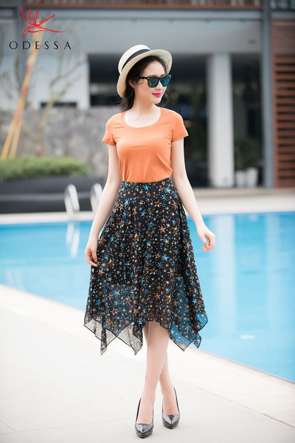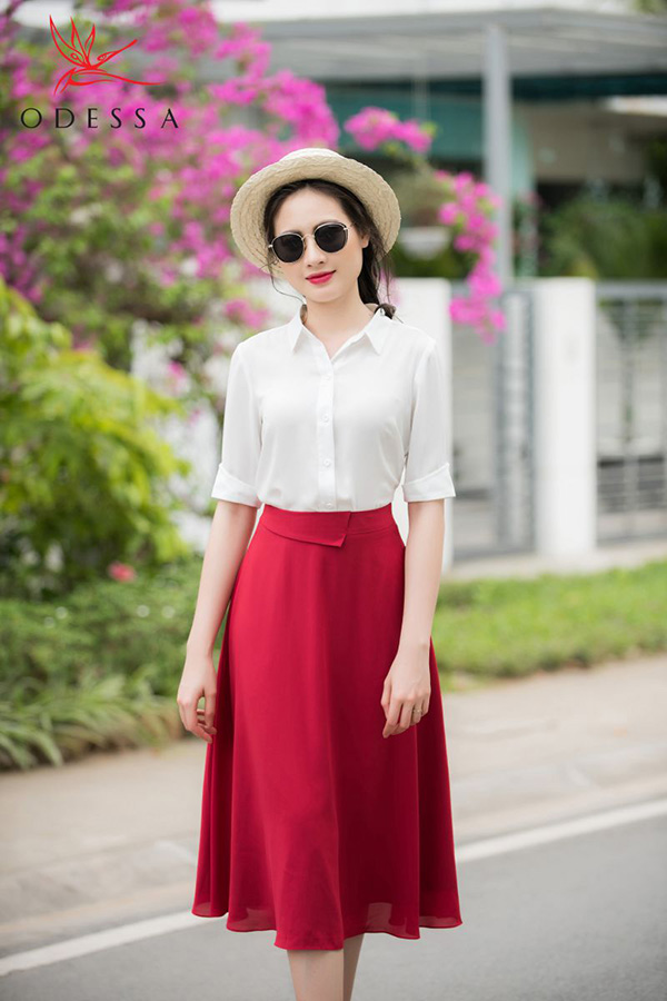 Chân váy xòe đơn sắc với chiều dài qua gối là thiết kế đặc trưng và cơ bản nhất mang đến nét duyên dáng, bay bổng ngay từ ánh mắt đầu tiên cho nàng. Khác với chân váy họa tiết hay chân váy bất đối xứng, chân váy xòe qua gối đơn sắc phải nhờ vào item đi kèm để trở nên nổi bật hơn. Chính vì vậy, với thiết kế này, lựa chọn được một chiếc áo thích hợp là vô cùng quan trọng. Quý cô nên chọn những thiết kế áo ôm nhẹ cơ thể đồng thời có họa tiết và màu sắc bắt mắt để kết hợp với chân váy xòe qua gối đơn sắc.