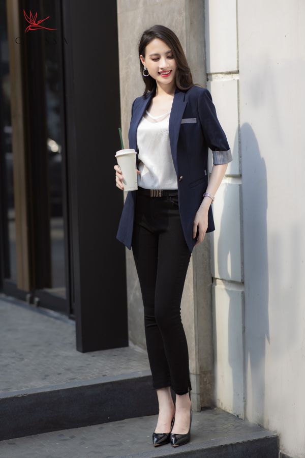Ngoài việc mix với chân váy xếp ly, bạn có thể mix cùng blazer.