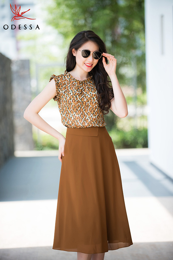 Áo sơ mi sát nách và chân váy midi