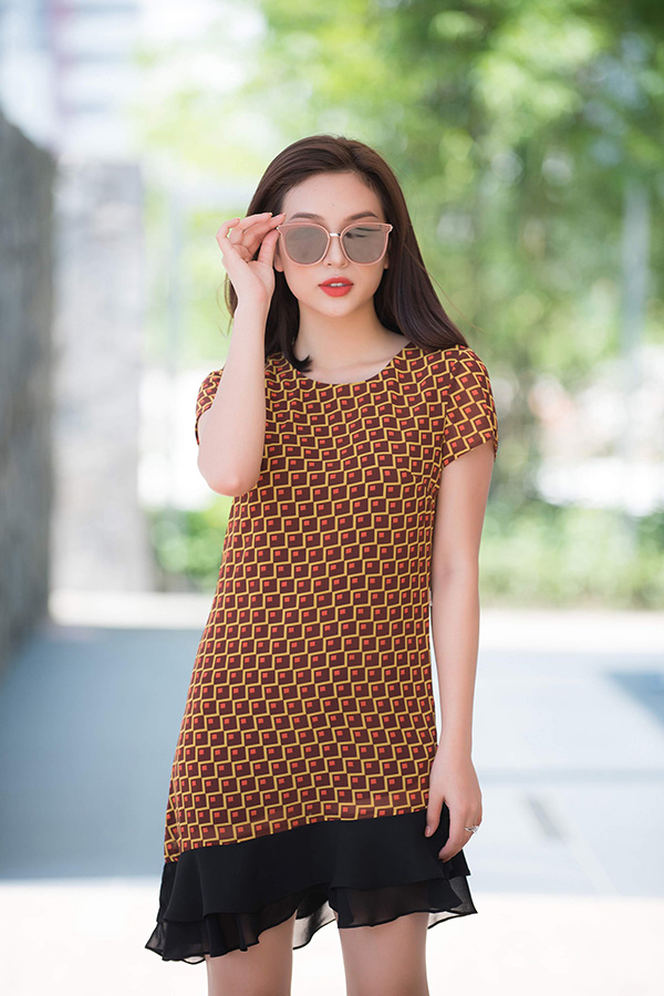 Đầm chữ A họa tiết ô vuông cách điệu