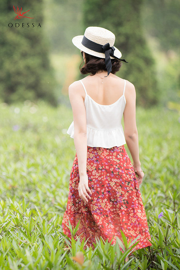 Áo hai dây họa tiết hoa đi cùng chân váy midi xẻ tà đồng bộ quyến rũ