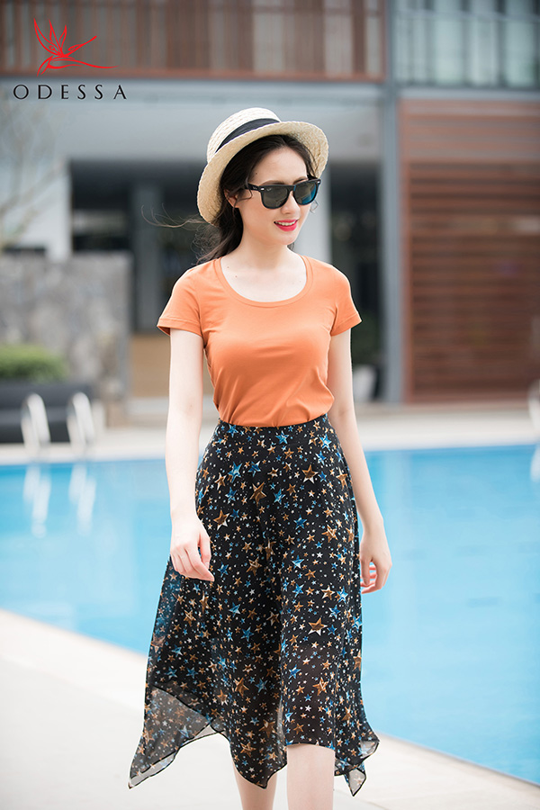 Chân váy xòe thường được kết hợp cùng áo phông khi nàng đi dạo phố