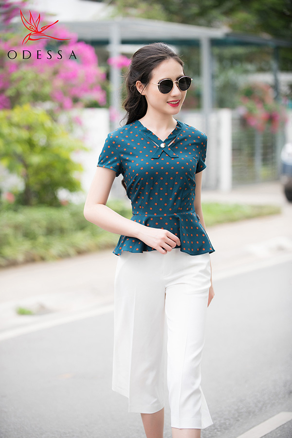 Áo sơ mi peplum chấm bi cách điệu cổ áo lạ mắt