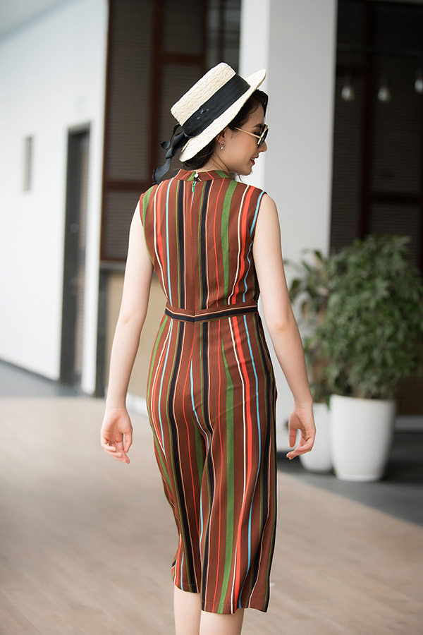 Giống thiết kế jumsuit đẹp và phong cách khác, DK1633 chia tách phần thân trên và thân dưới bằng một phần đai eo tinh tế và nhẹ nhàng tạo nên vẻ đẹp thời thượng, đầy cá tính. Nhưng điểm nhất thực sự tạo nên DK1633 lại là họa tiết kẻ sọc sắc màu mà nó sử dụng. Những đường kẻ sọc dọc theo thân bộ liền thân với những màu sắc bắt mắt trên nền vải nâu đất không chỉ tạo nên hiệu ứng thị giác vô cùng tốt mà còn làm cho jumsuit công sở này trở nên bắt mắt và nổi bật hơn.