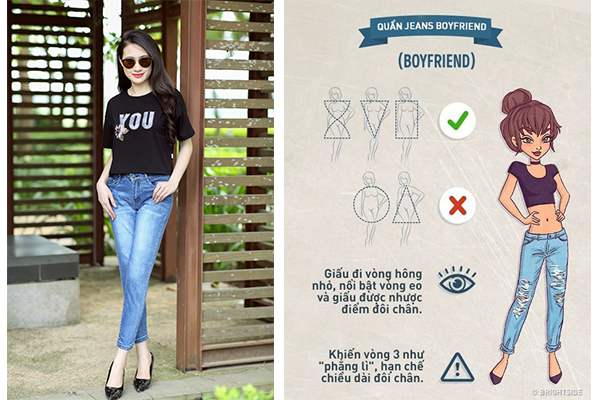 Quần Jeans Boyfriend có phần ống trên rộng che đi hông nhỏ, bật vòng eo con kiến đi đôi với đó là khả năng làm giảm sự chú ý vào đôi chân của bạn. Tuy nhiên, Jeans Boyfriend có thể khiến vòng ba của bạn trông phẳng lì và làm ngắn đôi chân của bạn nên nếu không đủ tự tin vào chiều cao của mình thì nên cân nhắc kĩ càng trước khi chọn Jeans Boyfriend nhé!