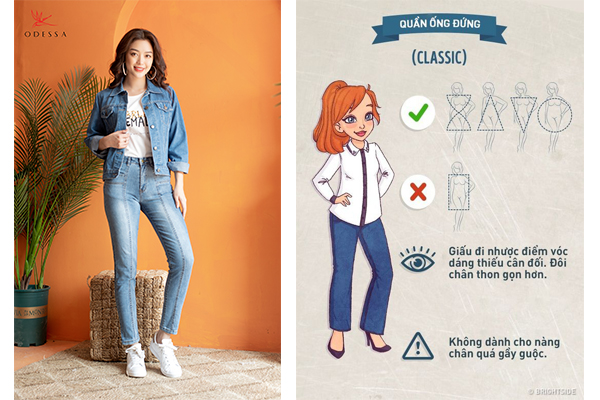 Quần Jeans Classic – quần Jeans ống đứng là dáng quần phù hợp với nhiều dáng người nhất, dù không chắc chắn tôn lên ưu điểm nhưng cũng không làm bạn lộ khuyết điểm trừ quý cô sở hữu dáng người hình chữ nhật hoặc cô này “quá thanh mảnh”.