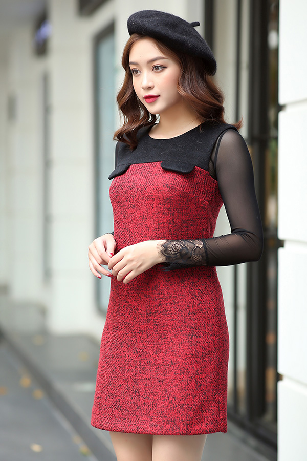 Đầm dạ đẹp, dáng suông với tone màu đỏ chủ đạo, trẻ trung và nổi bật