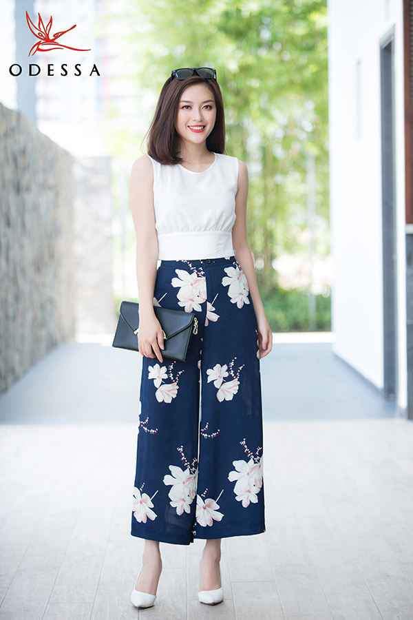 Quần ống rộng họa tiết Tropical Print thời thượng kết hợp sơ mi trắng sát nách