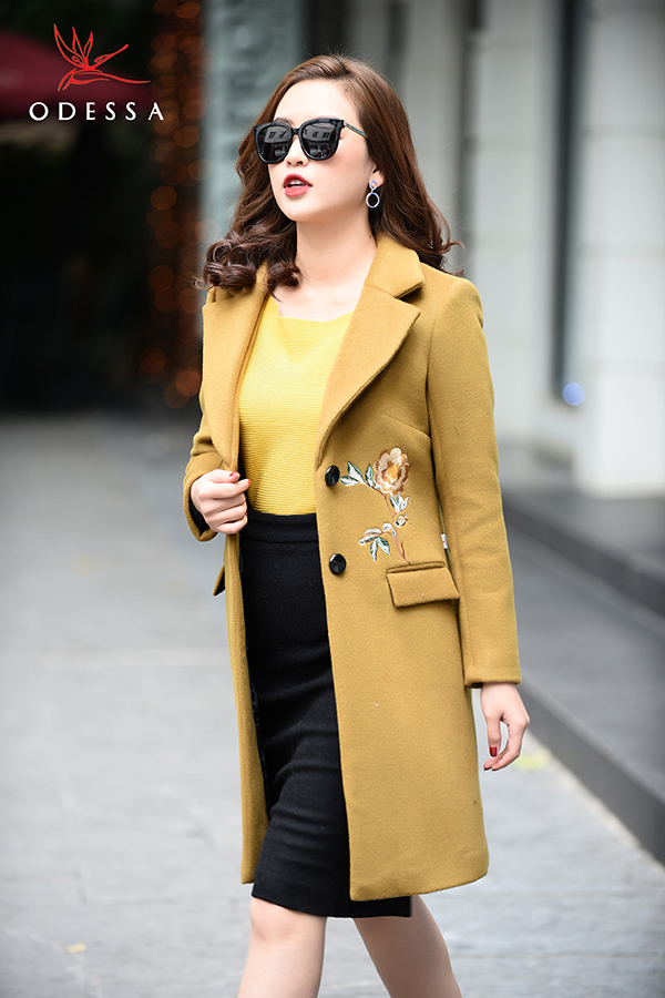 Ngoài tay loe, áo khoác dạ thêu hoa cũng là điểm mới vô cùng hấp dẫn trên những thiết kế áo khoác dạ Hàn Quốc năm nay